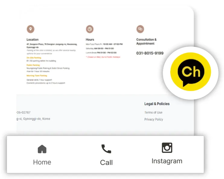 오른쪽 하단에는 카카오톡 채널이나 채널톡 같은 상담 채널도 연결할 수 있어서 실제 홈페이지처럼 활용하실 수 있고요.