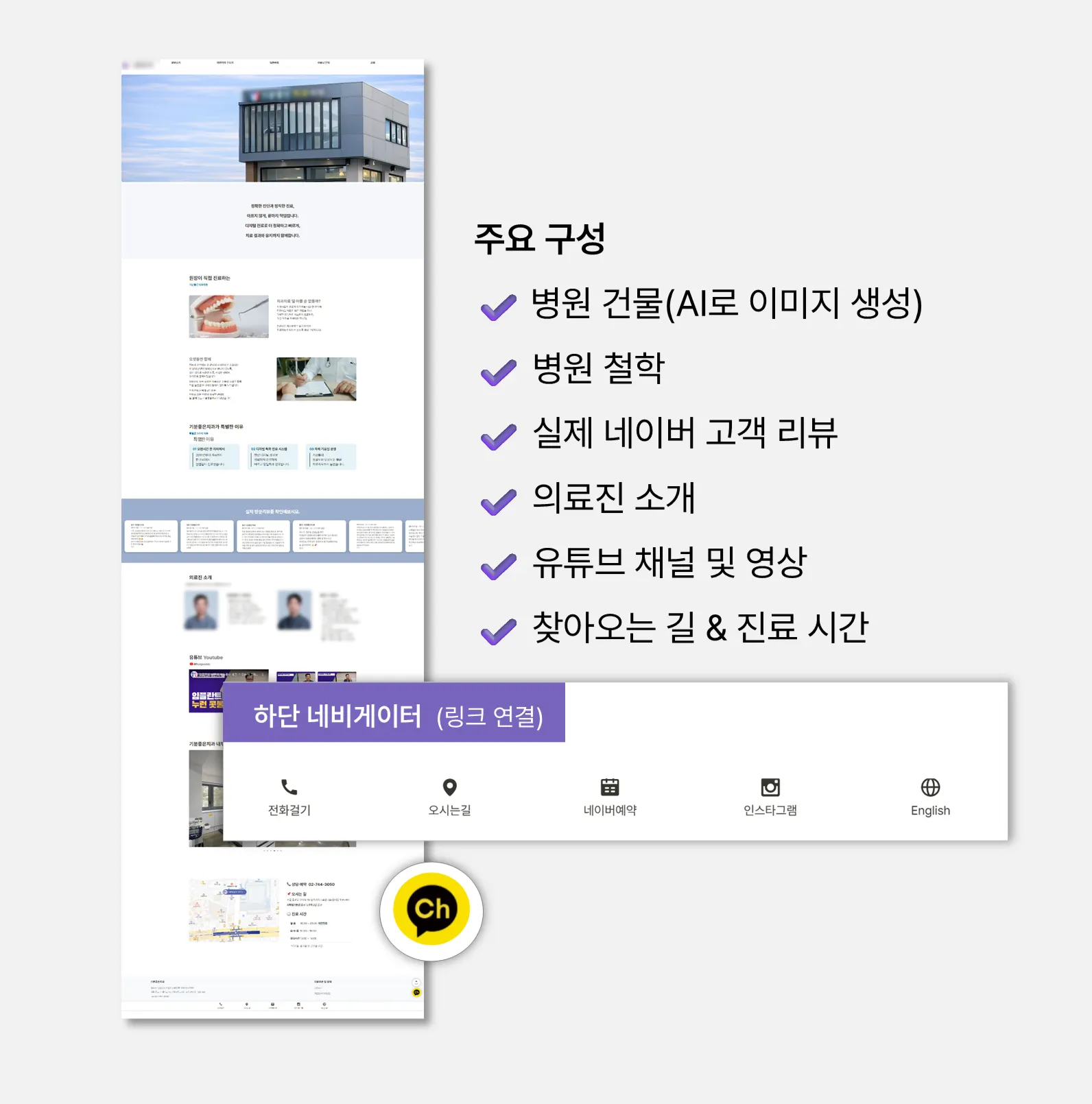 다만 요즘은 병원을 검색했을 때 공식 웹사이트가 하나쯤은 있는 것만으로도 환자 입장에서 신뢰도가 확 달라지다 보니, “병원을 대표할 수 있는 간단한 웹페이지라도 하나 있으면 좋겠다”는 니즈가 있으셨습니다.