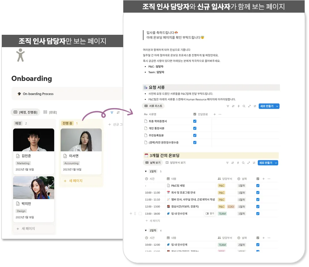 인사 담당자는 메인 온보딩 페이지와 세부페이지를 보면서 전체적으로 관리하고,