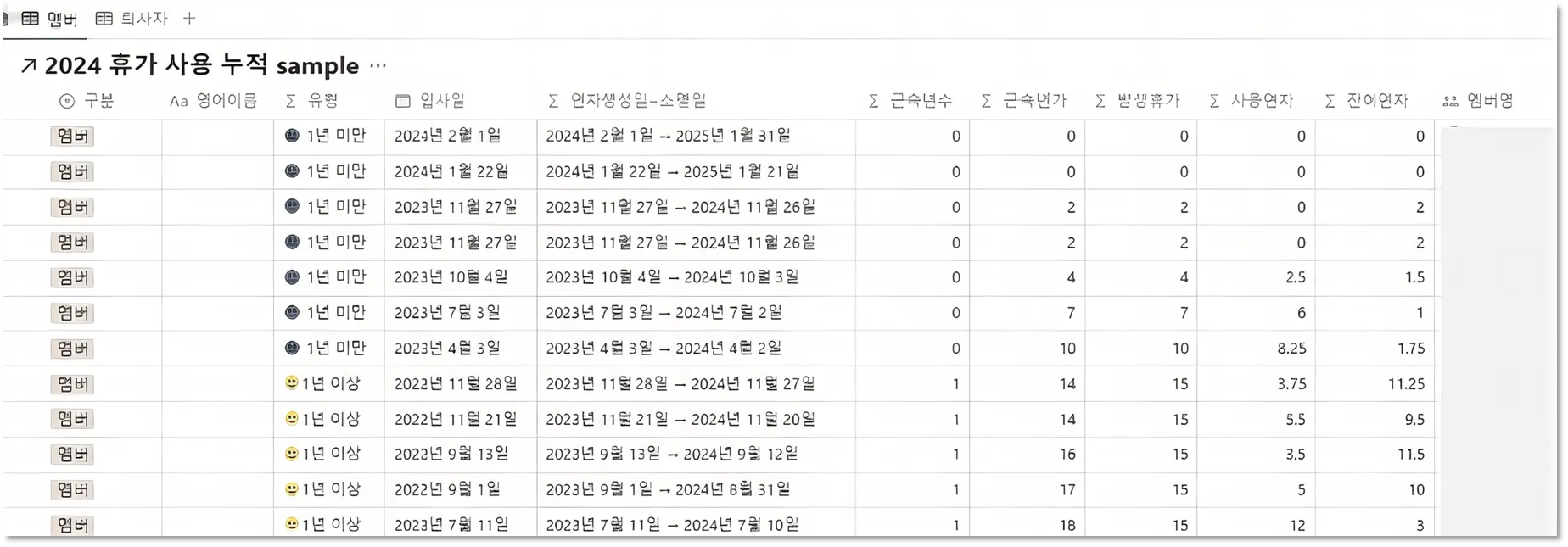 멤버별로 근속연수에 따른 발생 연차, 사용 연차, 잔여 연차를 한 화면에서 관리할 수 있습니다.