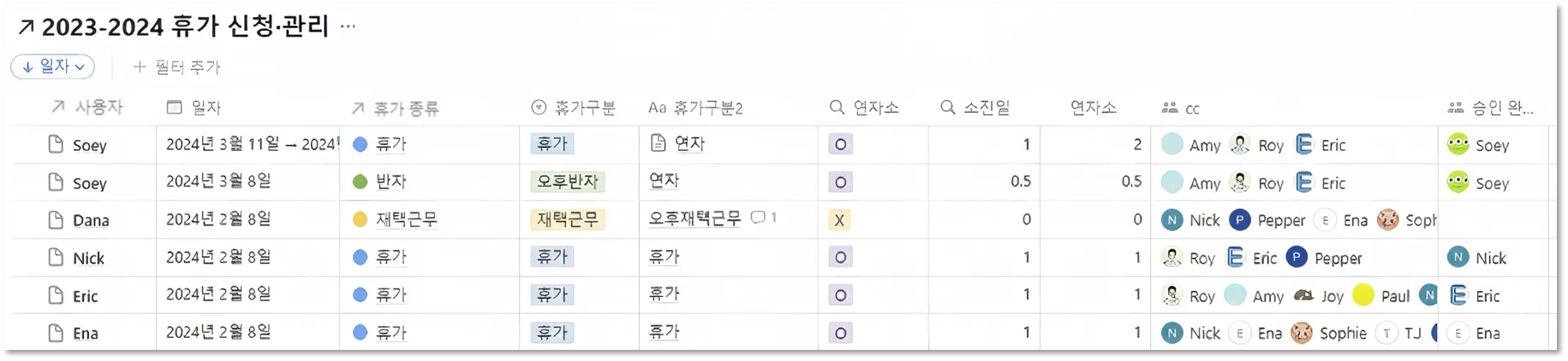 연차가 차감되지 않는 항목도 부재일로 기록해 공백 현황이 보이도록 구성했습니다.