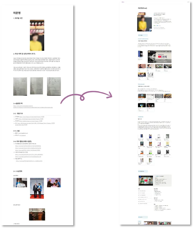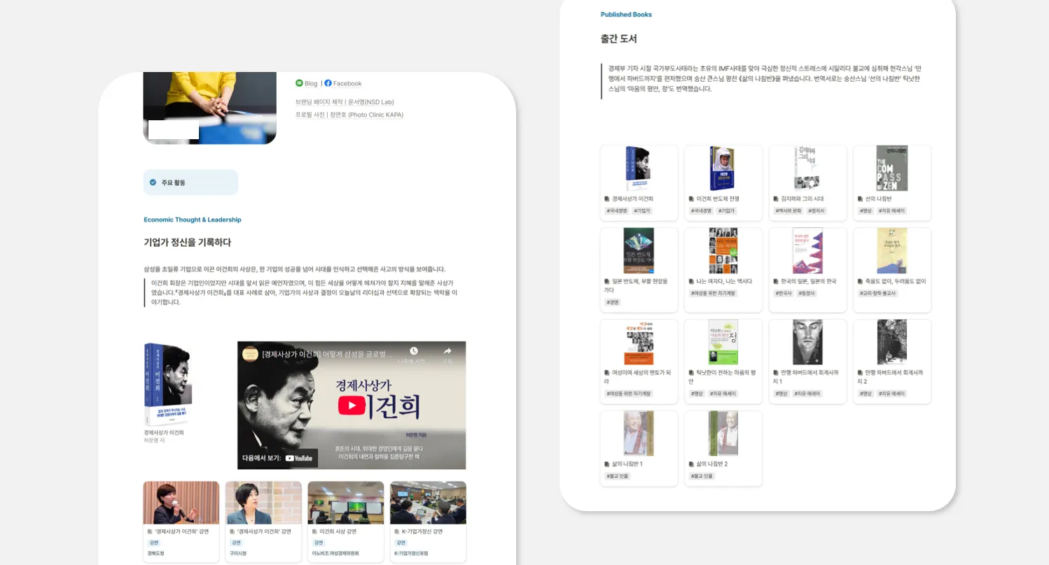 여러 경험과 결과물들을 단순히 나열하기보다는, “이 분은 어떤 분야에 강점을 가진 분인지”, 그리고 “앞으로 어떤 시선과 이야기를 세상과 나누고 싶은 분인지”가 자연스럽게 드러날 수 있도록 구조를 잡았어요.