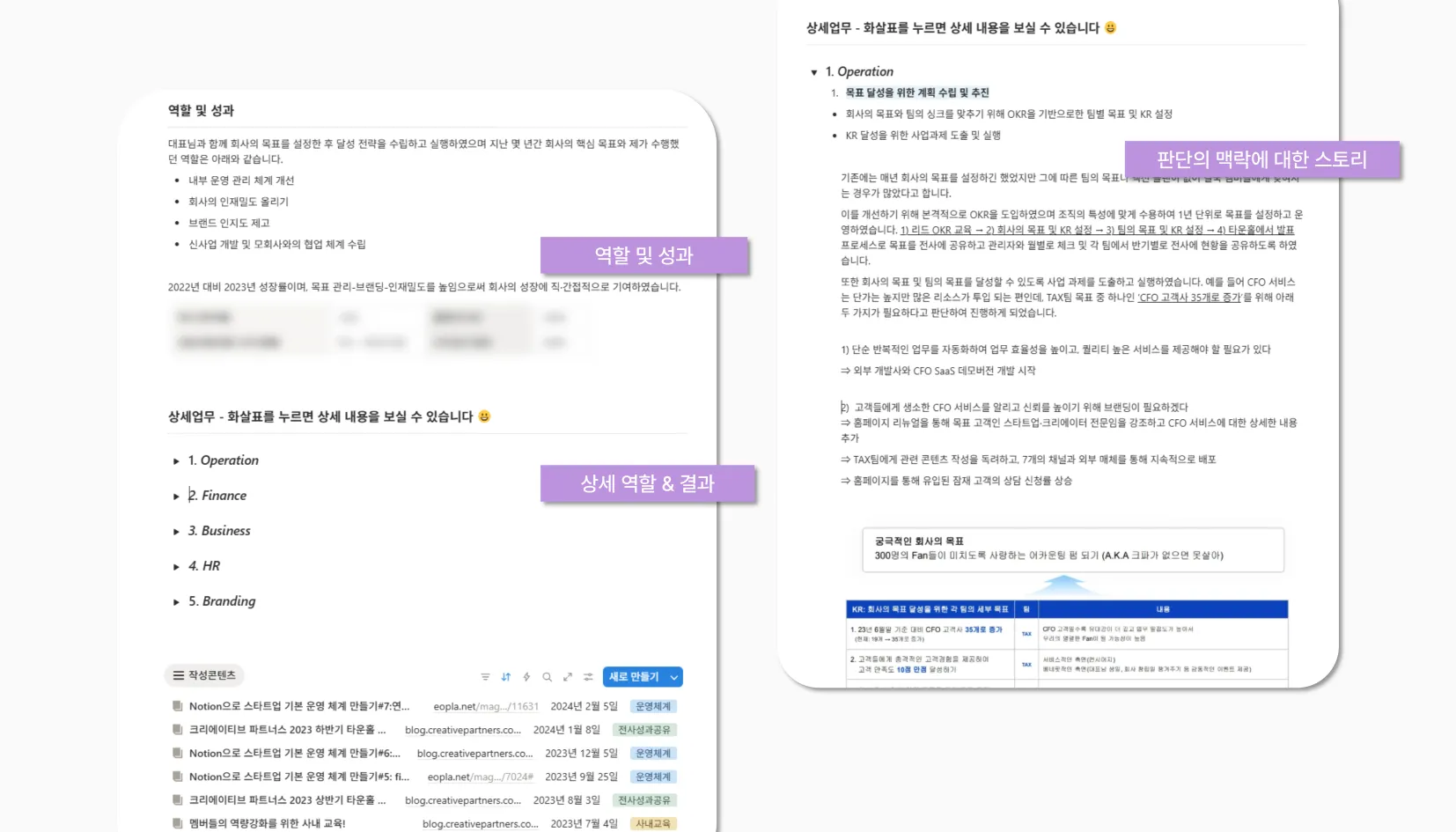 Operation/Finance/Branding/Business/HR과 같이 영역별로 나누고