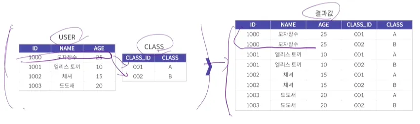 → 모든 데이터의 경우의 수를 조합하여 조회