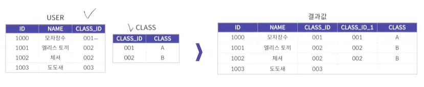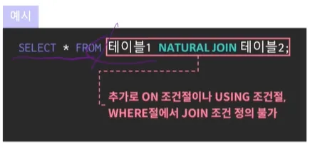 → Natural Join 자체가 동일한 이름을 갖는 모든 칼럼에 자동으로 등가 조인 수행