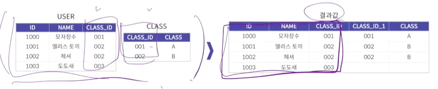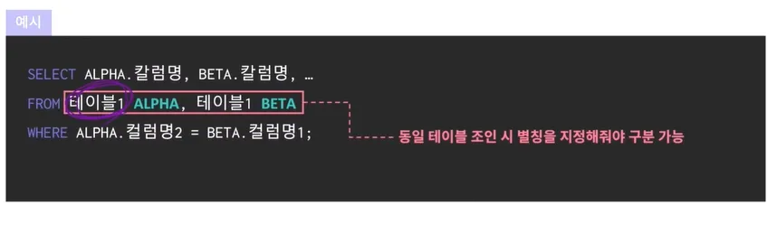 이를 수행하면 테이블과 칼럼 이름이 모두 동일하기 때문에 식별을 위해 별칭 필수