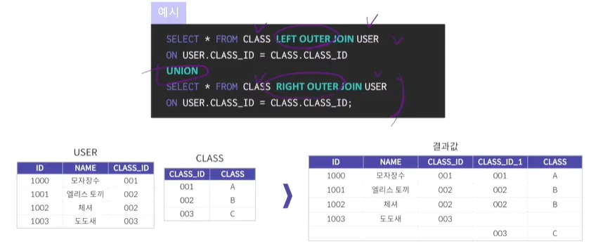 union은 중복된건 지워주기 때문에, outer join이 지원되지 않는 maria DB에서는 union을 사용하면 full outer join의 결과를 낼 수 있음