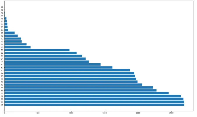 plt.barh(df['sub_grade'].value_counts().sort_index(ascending = False).index, df['sub_grade'].value_counts().values)
