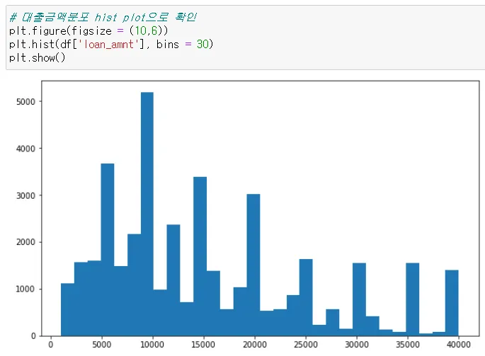 plt.hist(df[’loan_amnt’], bins = 30) bins는 막대를 더 늘려줌