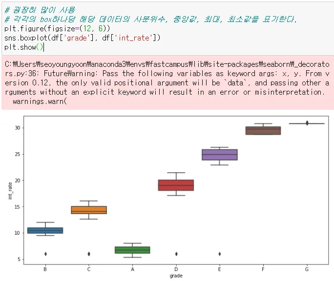 각각의 box 하나당 해당 데이터의 사분위수, 중앙값, 최대, 최소값을 표기함