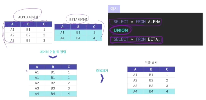 관계형 대수의 일반 집합 연산에서 합집합의 역할을 함