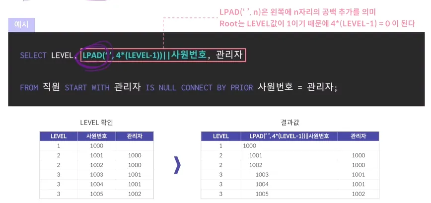 LPAD('', 4*(level-1)) || 사원번호 → b 갯수만큼 a 문자열을 왼쪽에 배치
