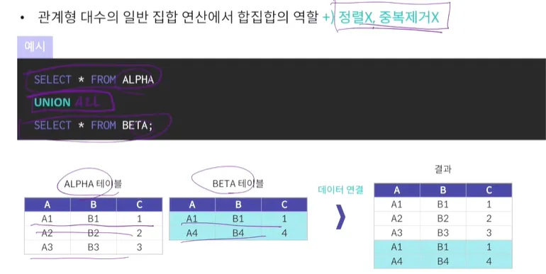다만, UNION과 달리 중복제거와 정렬을 하지 않음