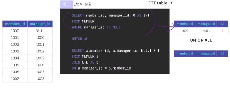 AS → 뒤에 있는 쿼리를 계속해서 재귀호출해서 CTE 테이블을 만드는 것