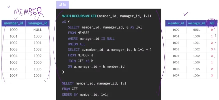 WITH RECURSIVE CTE (칼럼, 칼럼, 칼럼) → 호출하고자 하는 칼럼명이 옴