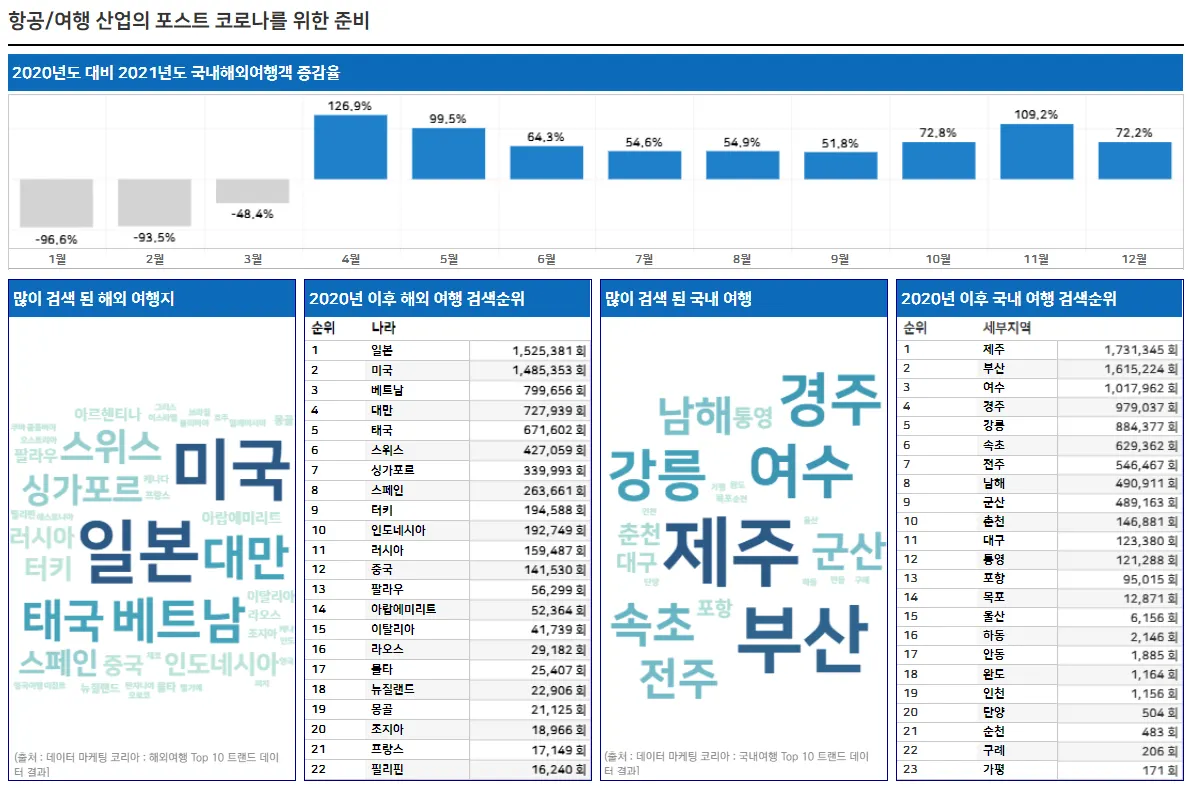 → 2021년의 여행 트랜드, 목적지 검색량 데이터 등을 활용하여 2022년을 위해 준비해야 할 국내/해외 목적지를 간략히 예측해보자 하였습니다.