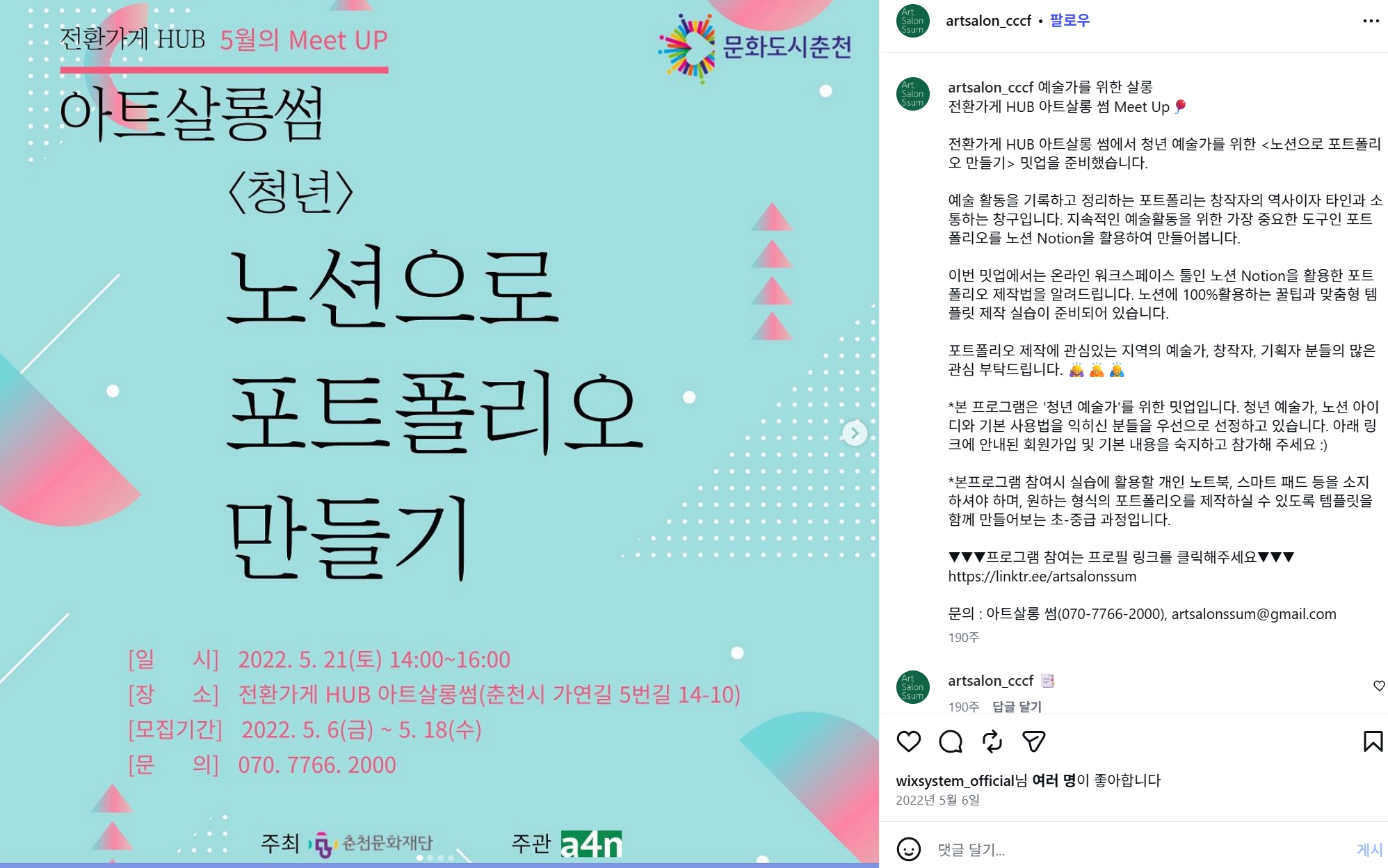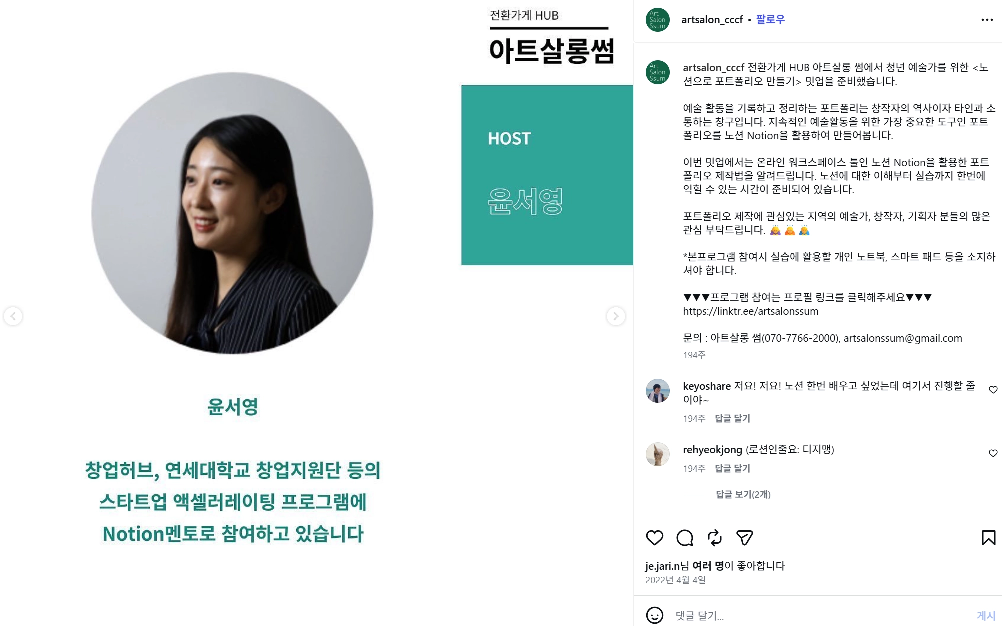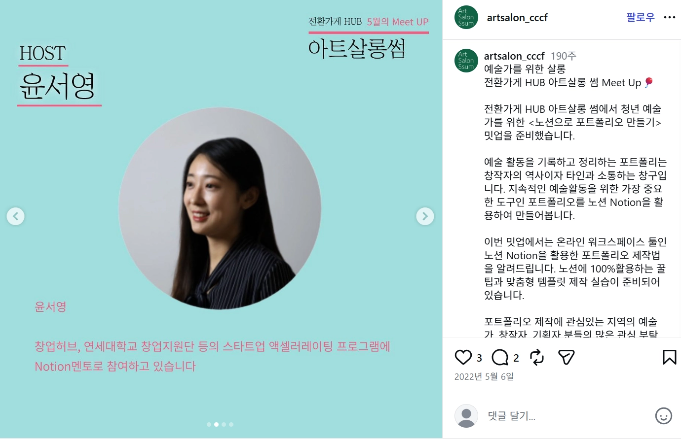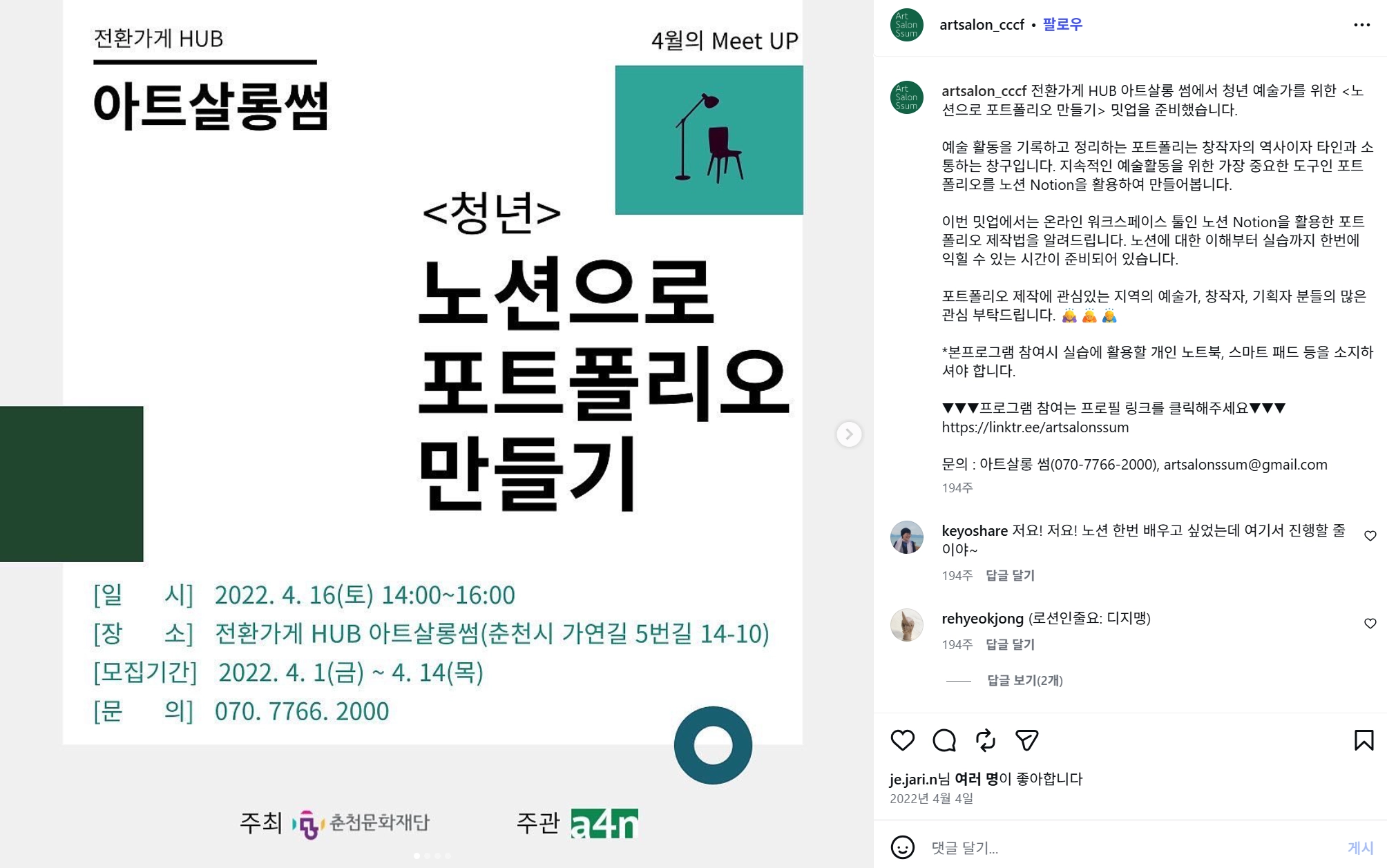 아트살롱썸 on Instagram: "예술가를 위한 살롱 전환가게 HUB 아트살롱 썸 Meet Up🎈 전환가게 HUB 아트살롱 썸에서 청년 예술가를 위한 <노션으로 포트폴리오 만들기> 밋업을 준비했습니다. 예술 활동을 기록하고 정리하는 포트폴리는 창작자의 역사이자 타인과 소통하는 창구입니다. 지속적인 예술활동을 위한 가장 중요한 도구인 포트폴리오를 노션 Notion을 활용하여 만들어봅니다. 이번 밋업에서는 온라인 워크스페이스 툴인 노션 Notion을 활용한 포트폴리오 제작법을 알려드립니다. 노션에 100%활용하는 꿀팁과 맞춤형 템플릿 제작 실습이 준비되어 있습니다. 포트폴리오 제작에 관심있는 지역의 예술가, 창작자, 기획자 분들의 많은 관심 부탁드립니다. 🙇♀️🙇🙇♂️ *본 프로그램은 '청년 예술가'를 위한 밋업입니다. 청년 예술가, 노션 아이디와 기본 사용법을 익히신 분들을 우선으로 선정하고 있습니다. 아래 링크에 안내된 회원가입 및 기본 내용을 숙지하고 참가해 주세요 :) *본프로그램 참여시 실습에 활용할 개인 노트북, 스마트 패드 등을 소지 하셔야 하며, 원하는 형식의 포트폴리오를 제작하실 수 있도록 템플릿을 함께 만들어보는 초-중급 과정입니다. ▼▼▼프로그램 참여는 프로필 링크를 클릭해주세요▼▼▼ https://linktr.ee/artsalonssum 문의 : 아트살롱 썸(070-7766-2000), artsalonssum@gmail.com"