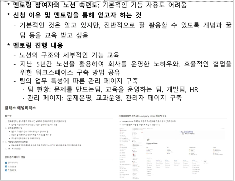 주요내용: Notion기반 스타트업 운영 시스템 구축 멘토링. 기업의 니즈 & 현황 맞춤형 워크스페이스 설계