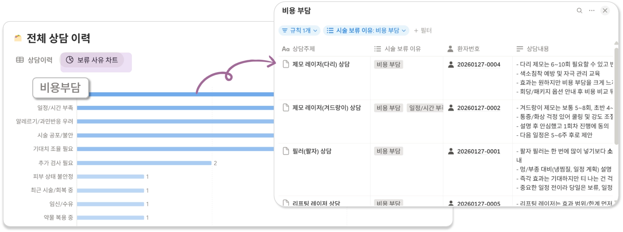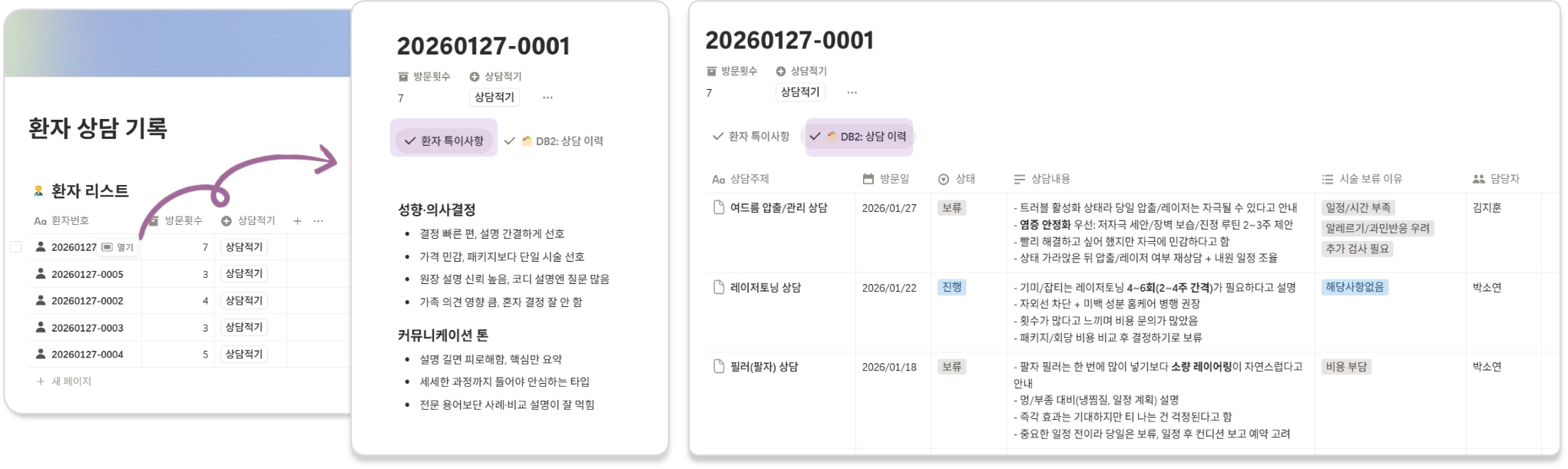 환자별 특징과 상담 기록, 시술 보류 이유 등을 함께 관리할 수 있는 구조입니다.