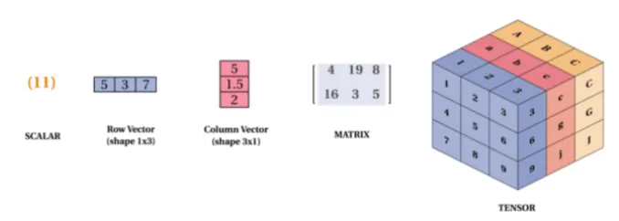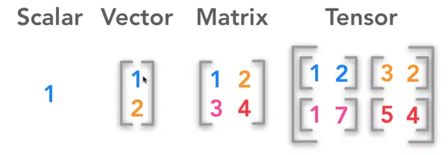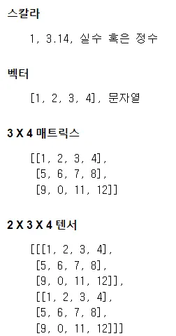 Tensor: 메트릭스에서 축이 하나 늘어나게 되면 3차원이 됨 (e.g. 이미지, 동영상)