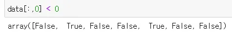 data[ : , 0] < 0 → 첫 번째 column의 값들 중 0보다 작은 것