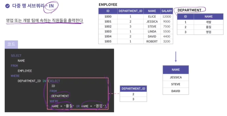 서브쿼리의 결과가 두 개 이상 행을 반환할 수 있음