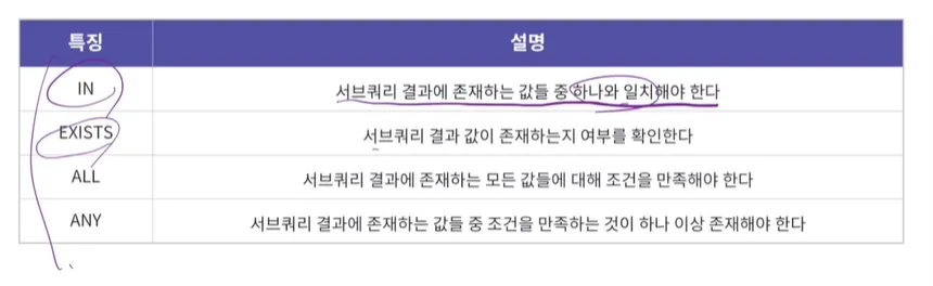 다중 행 비교 연산자(In, All, Any, Exist) 와 같이 사용된다