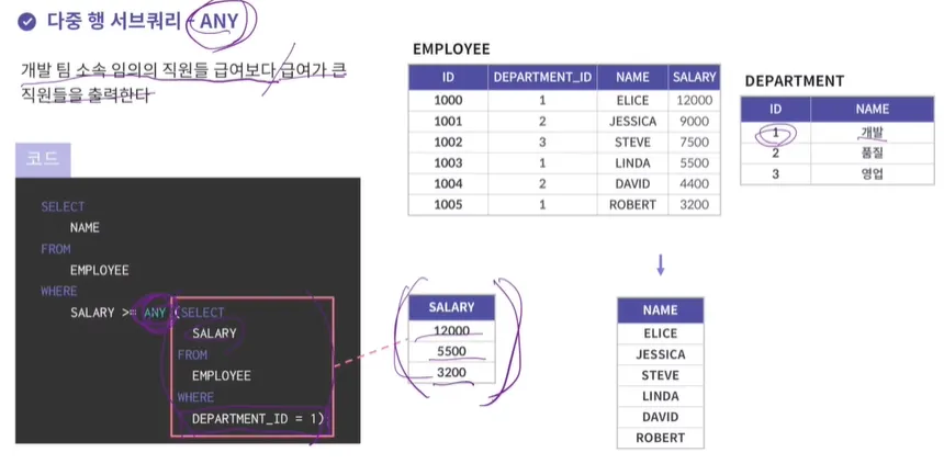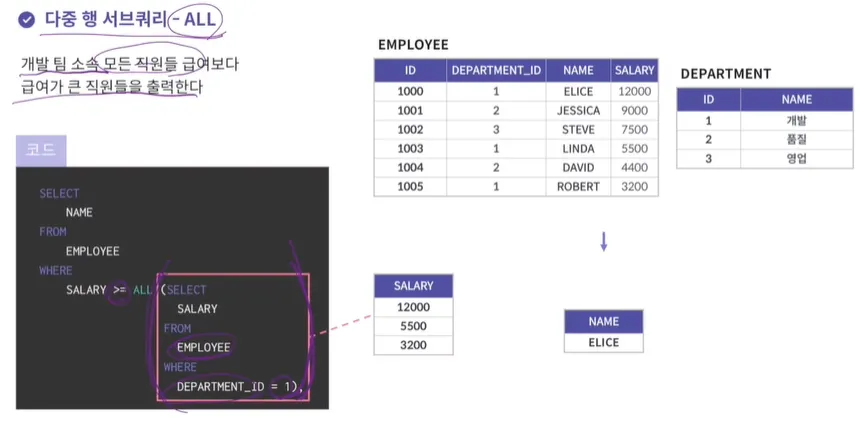 다 중행 서브쿼리 연산자