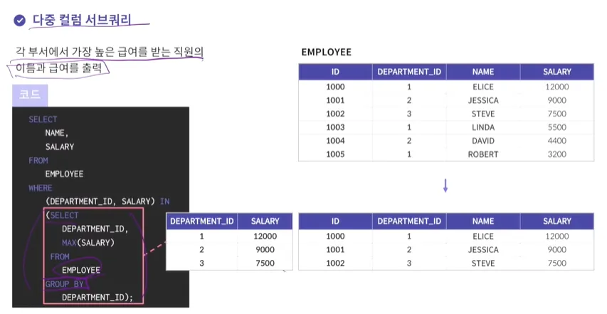 서브쿼리의 결과는 두개의 컬럼을 갖게 됨