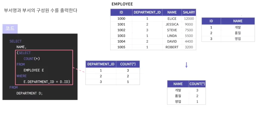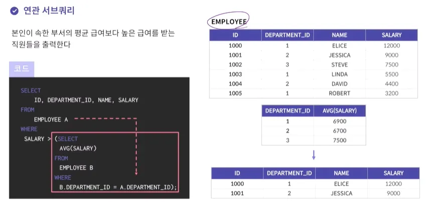 EMPLOYEE A가 서브쿼리 안의 A.DEPARTMENT_ID 로 연관되어서 영향을 끼치기 때문에