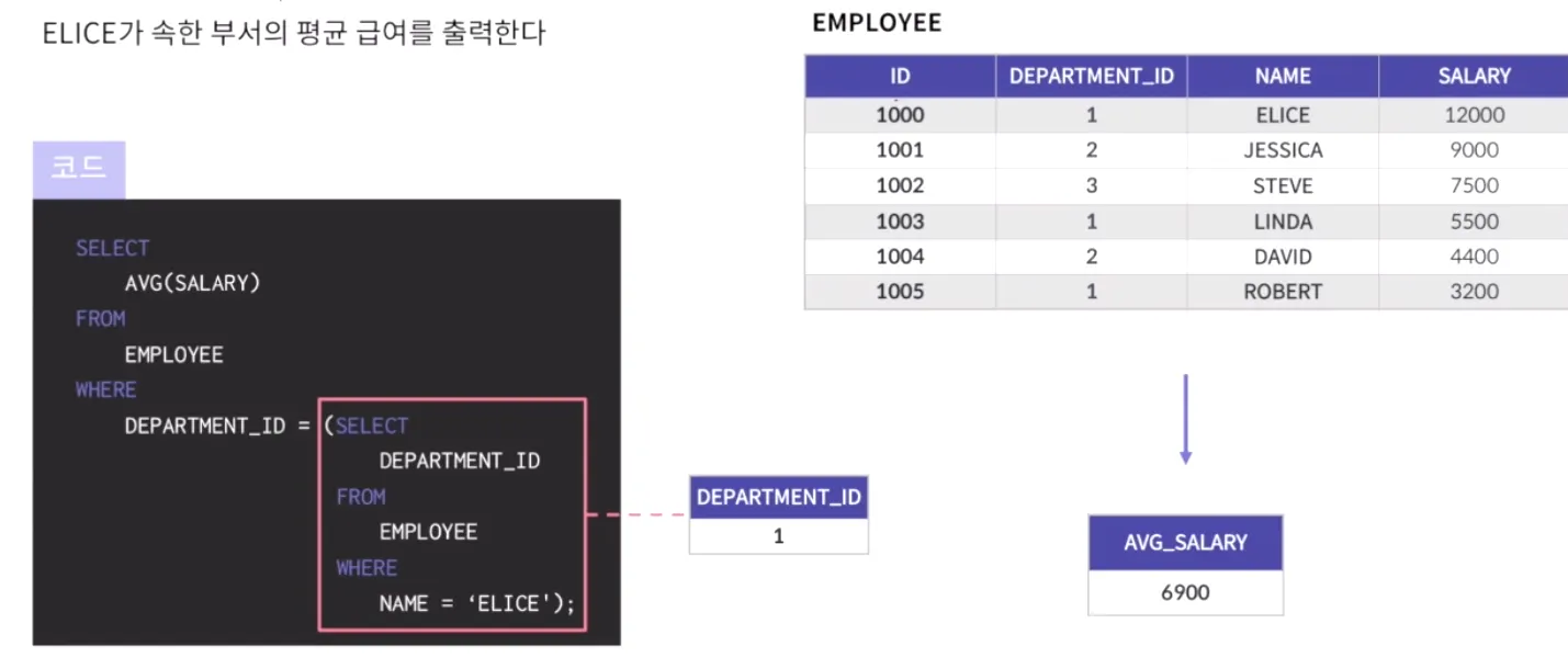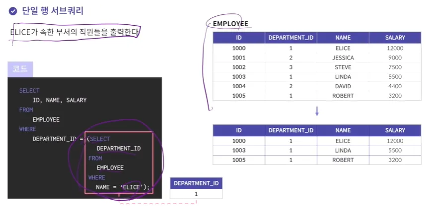 ELICE의 값은 한 개기 때문에 단일 행 서브쿼리라고 함