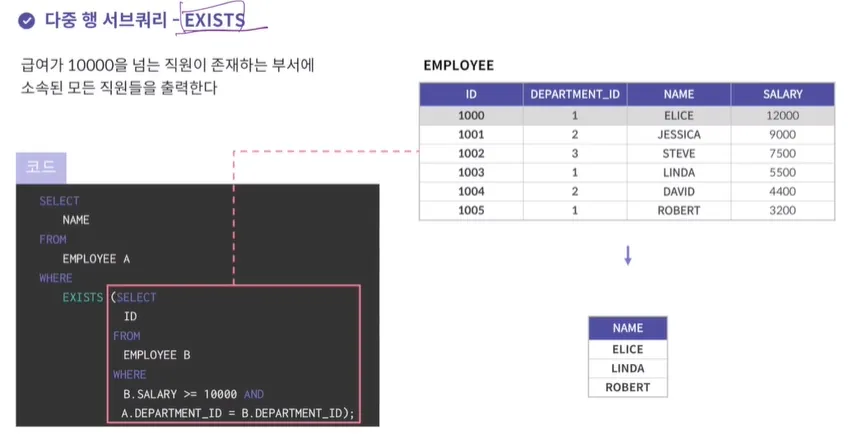 EXIST뒤에 서브쿼리의 값이 존재하느냐 안하느냐가 중요