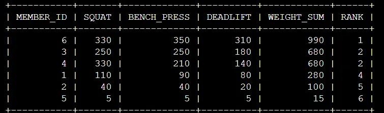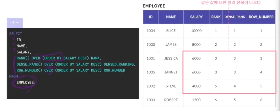 Rank: 동일한 값에는 동일한 순위를 부여하기 때문에 6000,6000에 대해서 3이라는