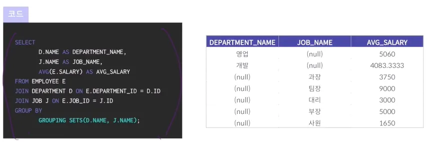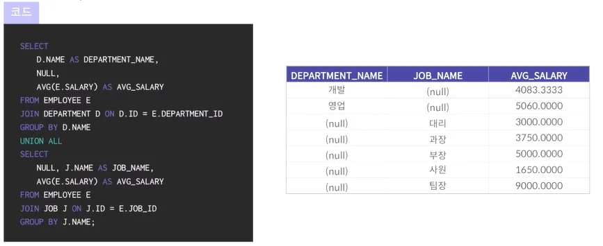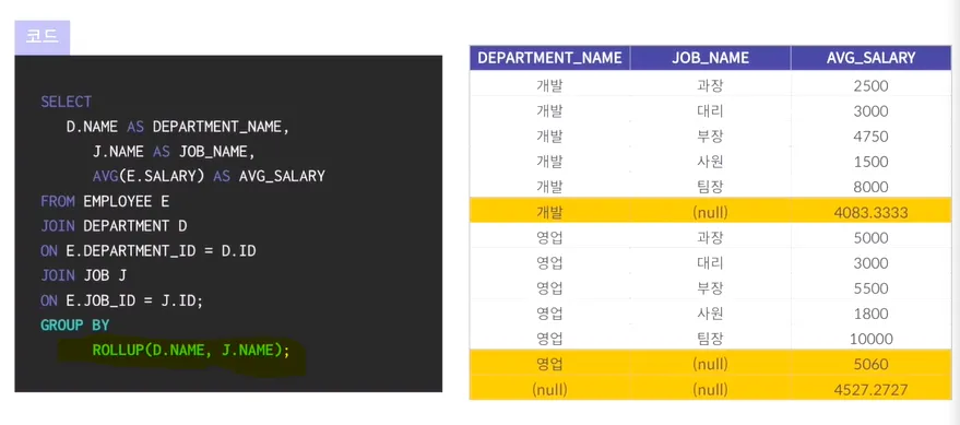 예시) 아래 DEPARTMENT_NAME은 영업, 개발 JOB_NAME은 각 직급별로 개별적인 통계 가능