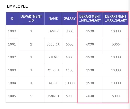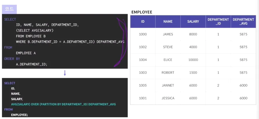 → AVG(SALARY) OVER(PARTITION BY소그룹으로 나누는 기준DEPARTMENT_ID) AS DEPARTMENT_AVG