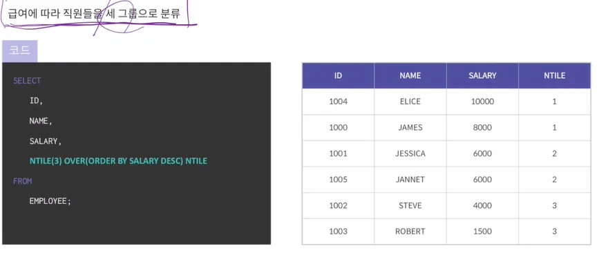 NTILE 3 → ORDER BY 기준으로 1,2,3으로 세개로 나눔
