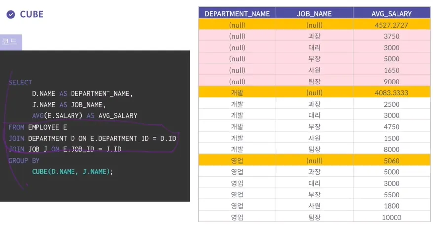 ROLLUP 함수에서 제공하는 결과를 포함해서, CUBE함수에서는 그룹화 하는 컬럼에 대한