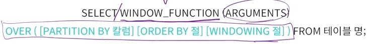 SELECT위에 어떤 윈도우 쓸것인지, 그 이후에는 ‘OVER’절을 사용