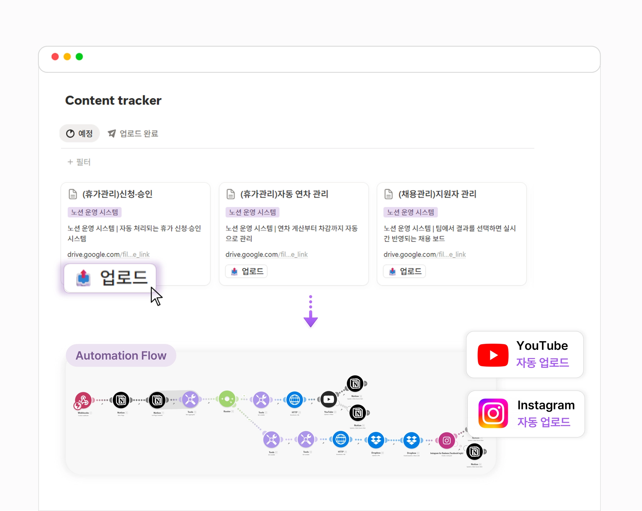 예시) 버튼 하나로 유튜브, 인스타그램 자동 업로드